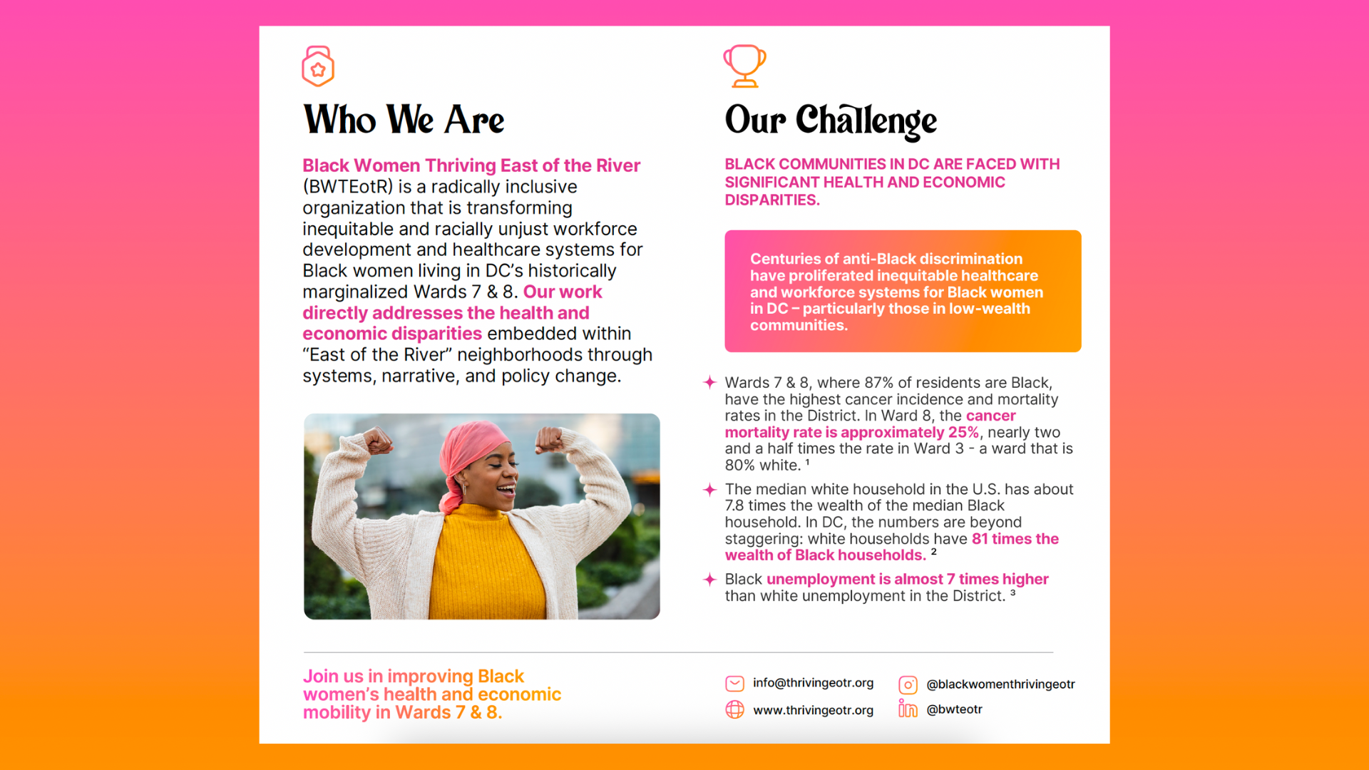 The Black Women Thriving East of the River (BWTEotR) was originally established in 2019 as a flagship initiative for the Jane Bancroft Robinson Foundation (JBRF) following JBRF’s shift to targeted funding in Wards 7 and 8. BWTEotR engages Black women with lived experience in cancer navigation and workforce development, working to address systemic challenges in the East of the River neighborhoods of Washington, D.C.